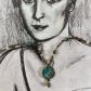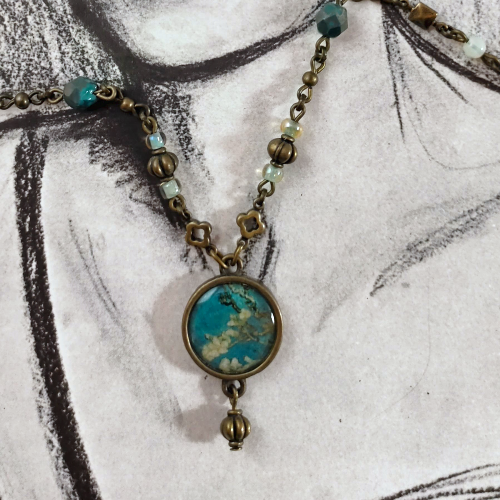 Material: Vintage-Bronze, Glasschliffperlen, Bronze-Elemente, Rocailles-Glasperlen, Cabochon-Anhänger, Papier, Kunststoff-Linse, Karabinerhaken-Verschluss
