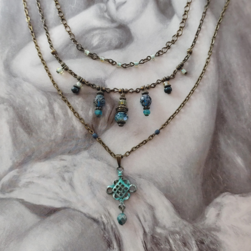 Material: Vintage-Bronze, Rocailles-Glasperlen, Glasschliffperlen, Bronze-Elemente, Karabinerhaken-Verschluss
