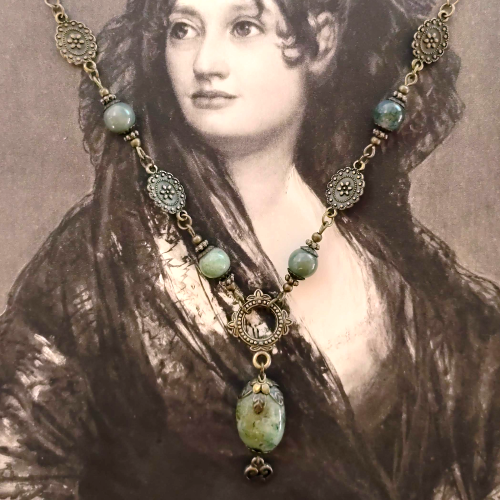 Die Moosacht-Perlen passen farblich perfekt zu dem ausgefallenen Prenit-Anhänger.