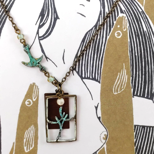 Ein Baum, ein Vogel und eine Perle, viel mehr braucht es nicht! Gerade ihre Einfachheit, Klarheit und die farblichen Akzente machen diese Kette so attraktiv.